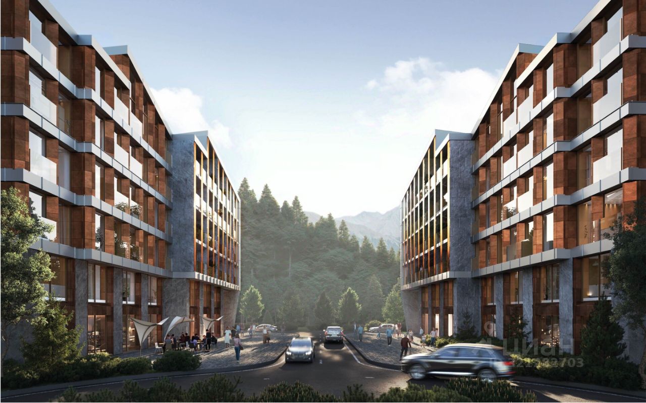 Отель будет располагаться в самом центре будущего курортного комплекса, на пересечении главных прогулочных улиц, расстояние до уже действующих подъемников всего 200 метров.