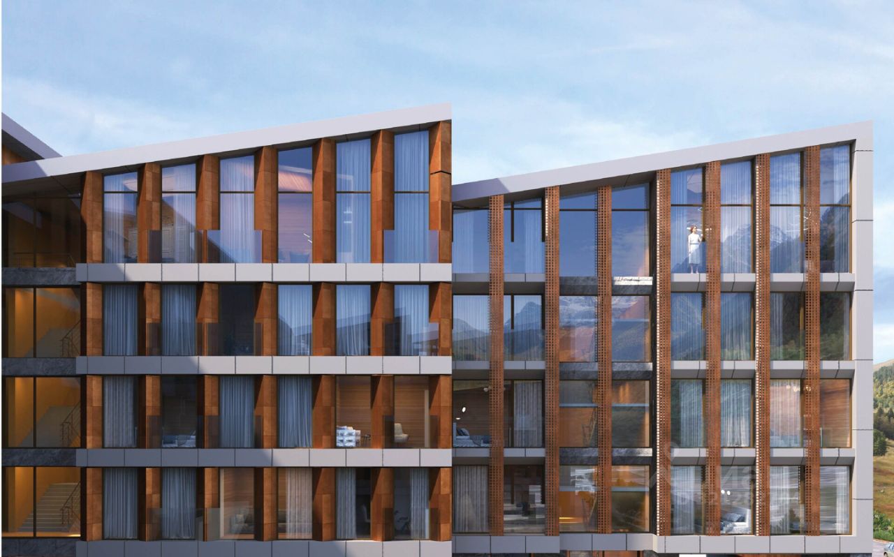 Отель будет располагаться в самом центре будущего курортного комплекса, на пересечении главных прогулочных улиц, расстояние до уже действующих подъемников всего 200 метров.
